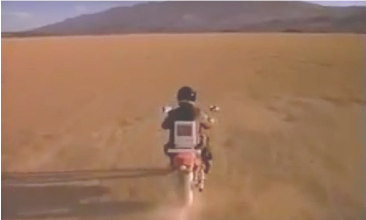 Out of Reach introduced the Macintosh Classic II. Most people at the time didn’t know that prices were falling for computers or that you could use them at work. So, it depicted a business person snatching a computer off the ground from his motorcycle on the way to work.