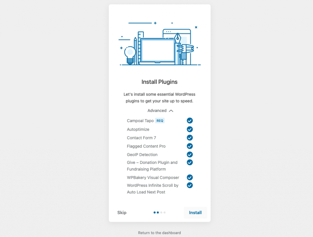 In the next step it will ask you to install the recommended plugins. You can deselect some plugins that you deem not necessary. Campoal Tapo plugin is required for the theme to be functional.