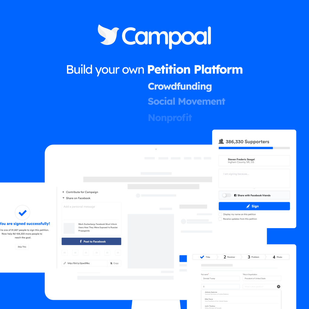 Campoal is a perfect WordPress theme to create the petition platform with fundraising. Where anyone can be start a social movement, collect supporters and raise funds to change something in society.