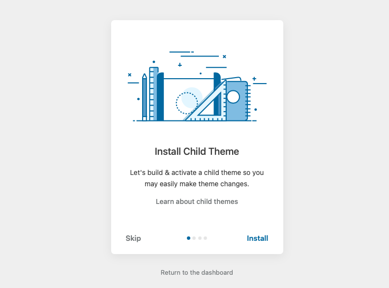 First step it’s ask you install Children theme, let click on Install. A child theme, as defined by the WordPress Codex, is a theme that “inherits the functionality and styling of another theme, called the parent theme.” Child themes are recommended to modify existing themes while still maintaining their design and code.