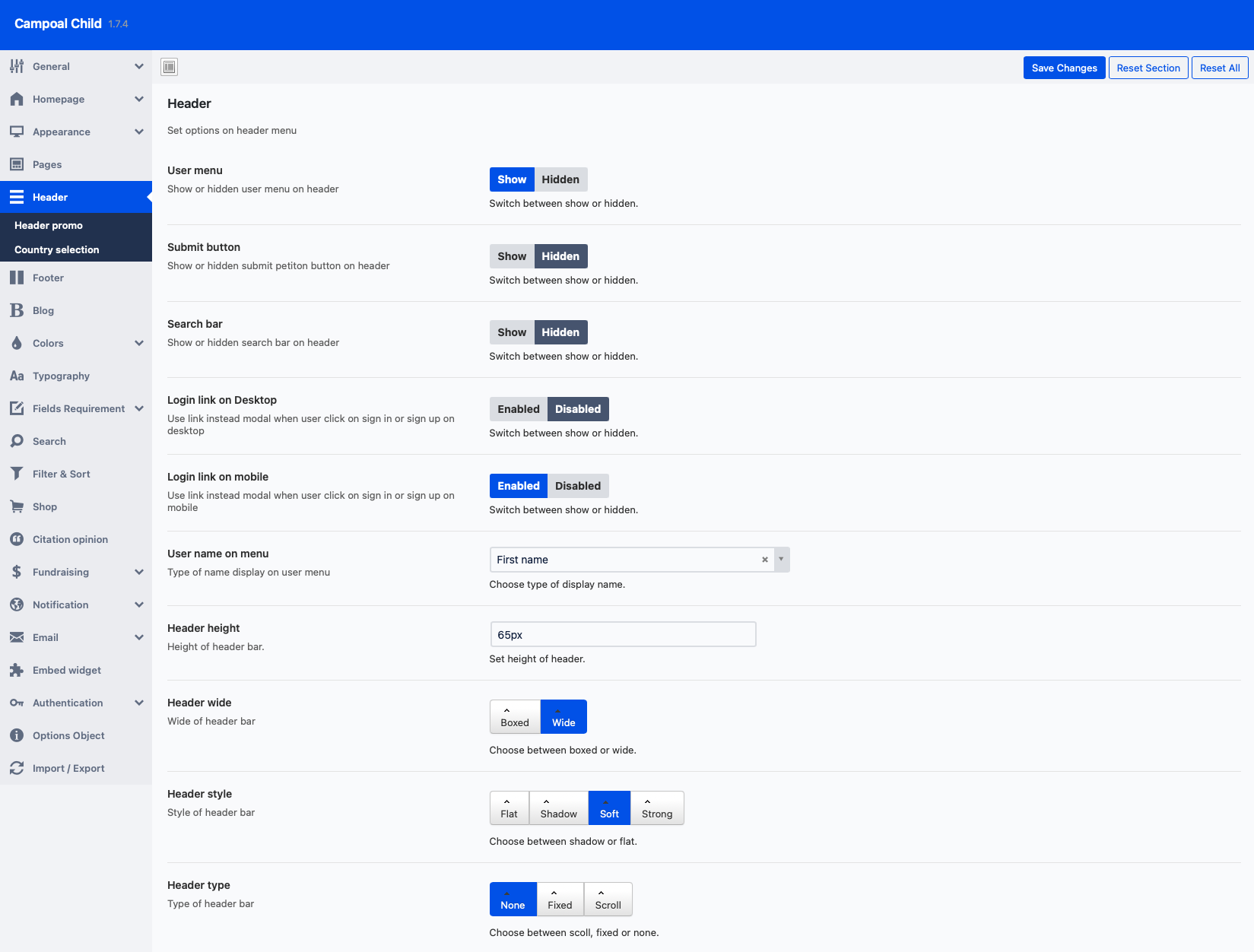 In this section, a very important setting is Show user menu in header. If this option is set, you offer users the posibility of register an login from front-end. Show submit button on header, select type of user’s display name on usermenu, type of header, mobile menu animation