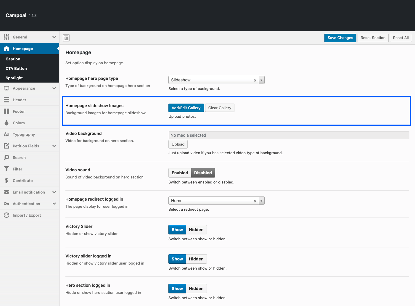 Here you set homepage header type, image shadow percent, enable or disable homepage caption, call to action button, spotlight section, victory petition section and fill the text on captions.