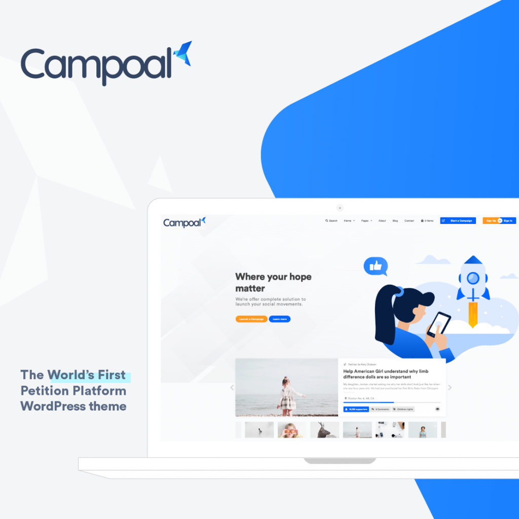 Campoal is a perfect WordPress theme use to create the petition platform with fundraising. Where anyone can be start a social movement, collect supporters and fundraising to change something in society.